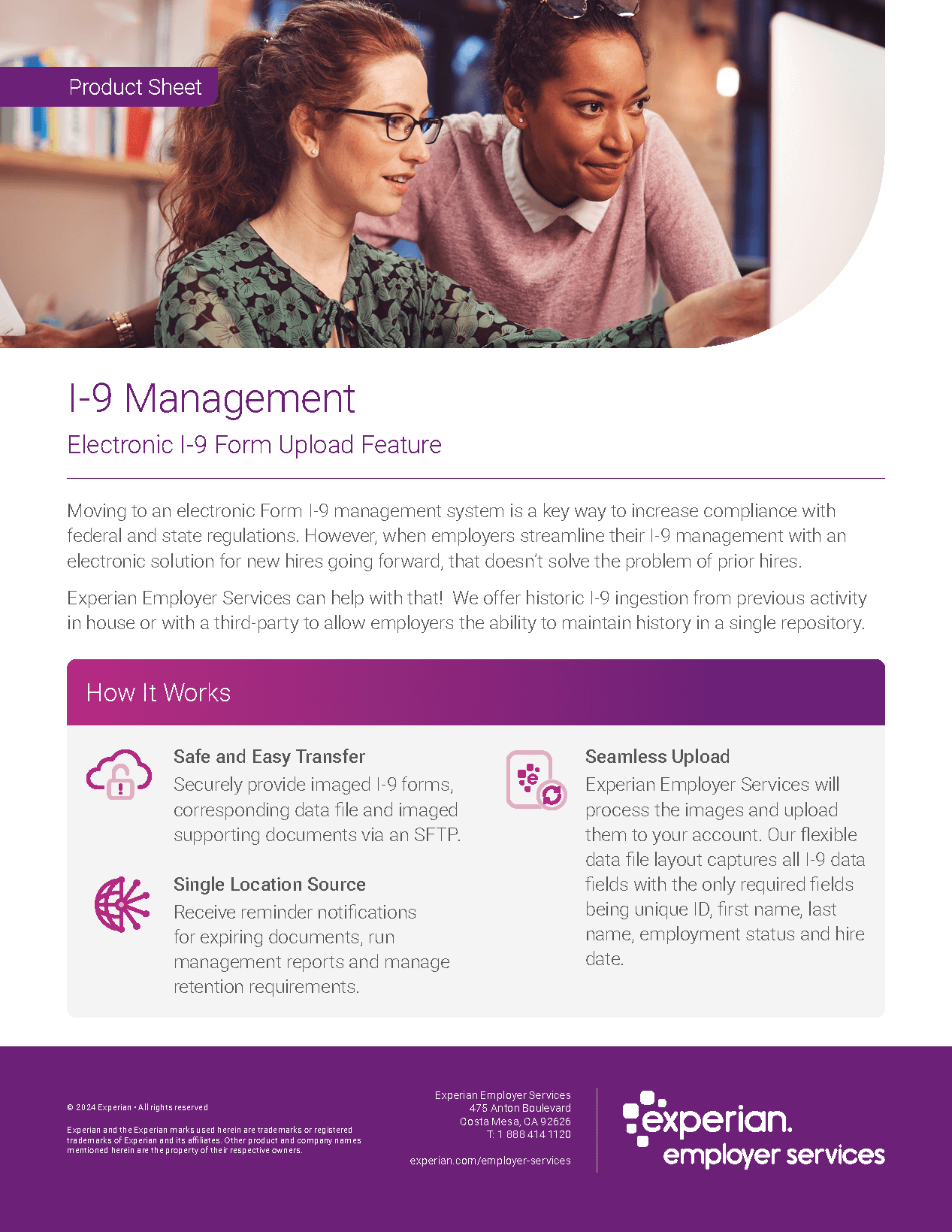 As you onboard new employees, Experian Employer Services makes it easy to ensure they properly fill out and complete their I-9 forms. From our user-friendly interface to features that help spot errors, remaining I-9 compliant is easier than ever. Explore some of the reasons why our clients choose us for their I-9 management: