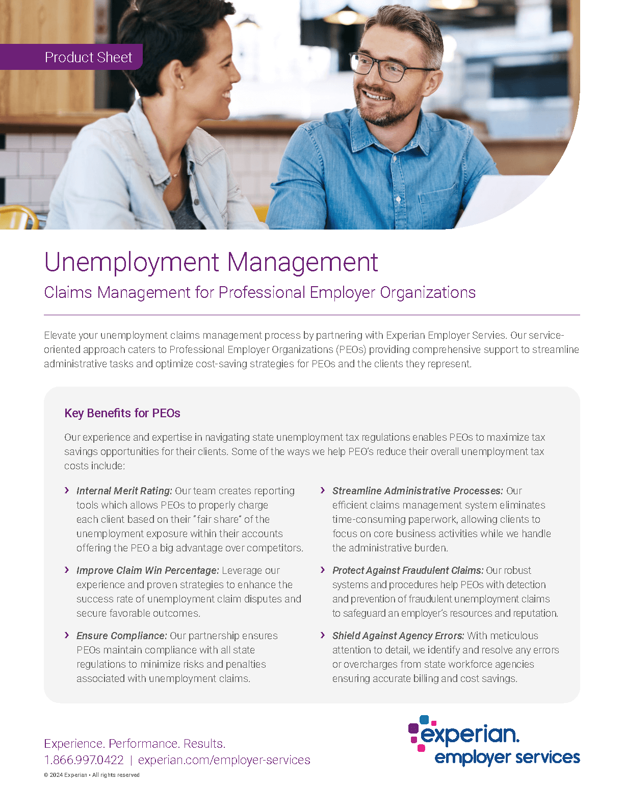 At Experian Employer Services, we specialize in workforce management solutions, including unemployment claims management. Our team can help in several ways, such as ensuring you remain compliant throughout the entire unemployment management process, handling unemployment hearings, streamlining unemployment insurance claims, appeals, wage determinations and more.