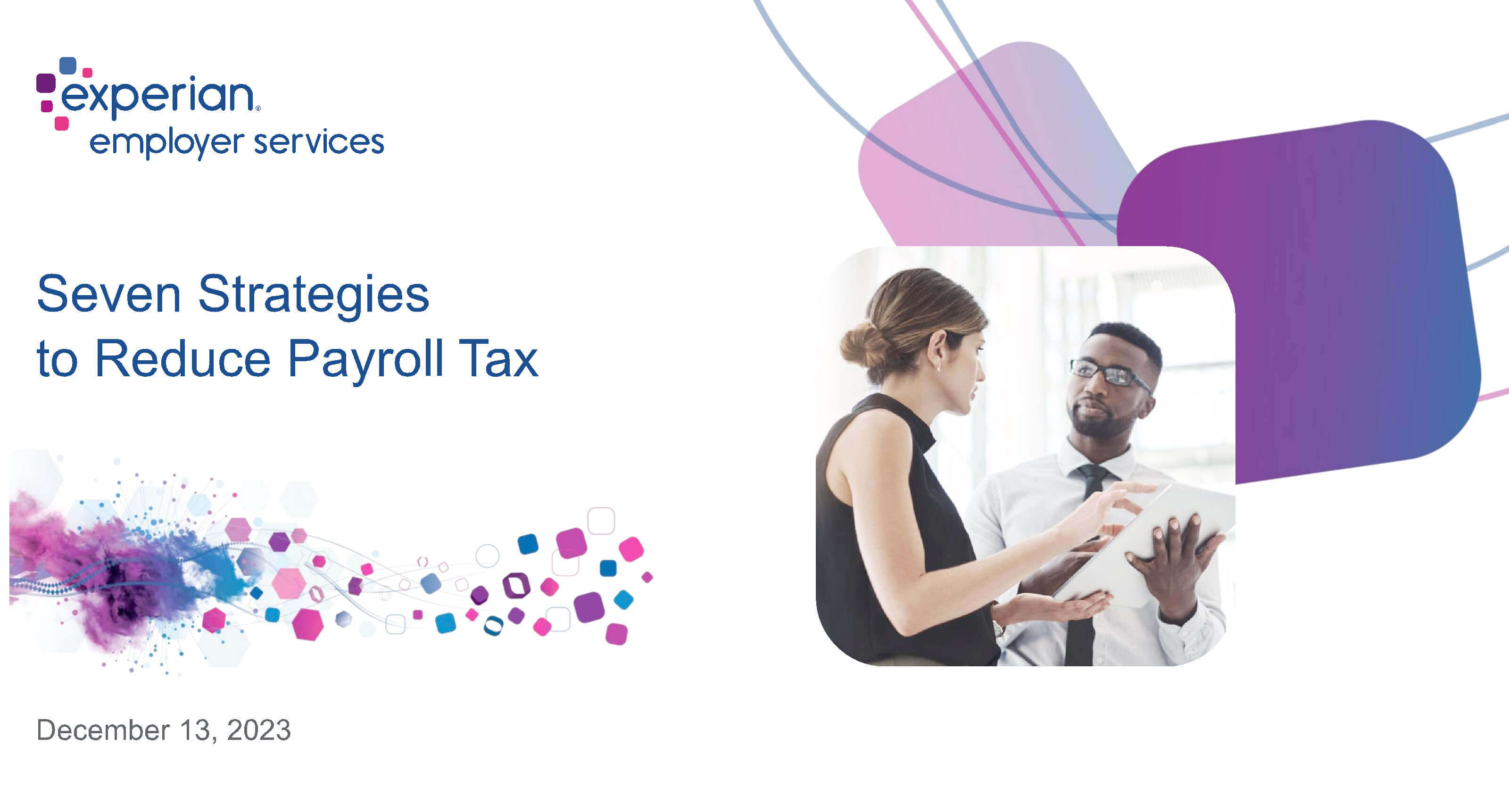 Join Experian Employer Services payroll tax experts as they review top strategies to reduce your payroll taxes in order to help you streamline your tax processes, eliminate overpayments and increase compliance.