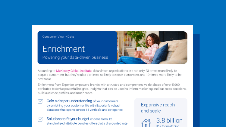 Experian Enrichment appends trusted demographic, lifestyle, behavioral, and financial attributes to your customer data so you can understand people more deeply and confidently make data-driven decisions.