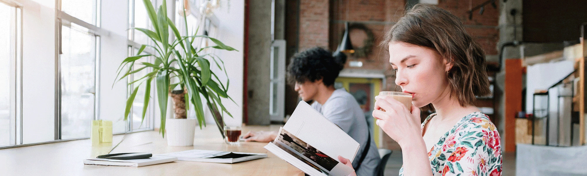 Woman reading a book at a cafe
