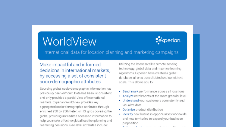 Experian WorldView is a global data set that provides consistent socio-demographic and geographic attributes for over 130 countries, helping marketers and planners identify opportunities, understand local audiences, and make strategic decisions across  international markets.